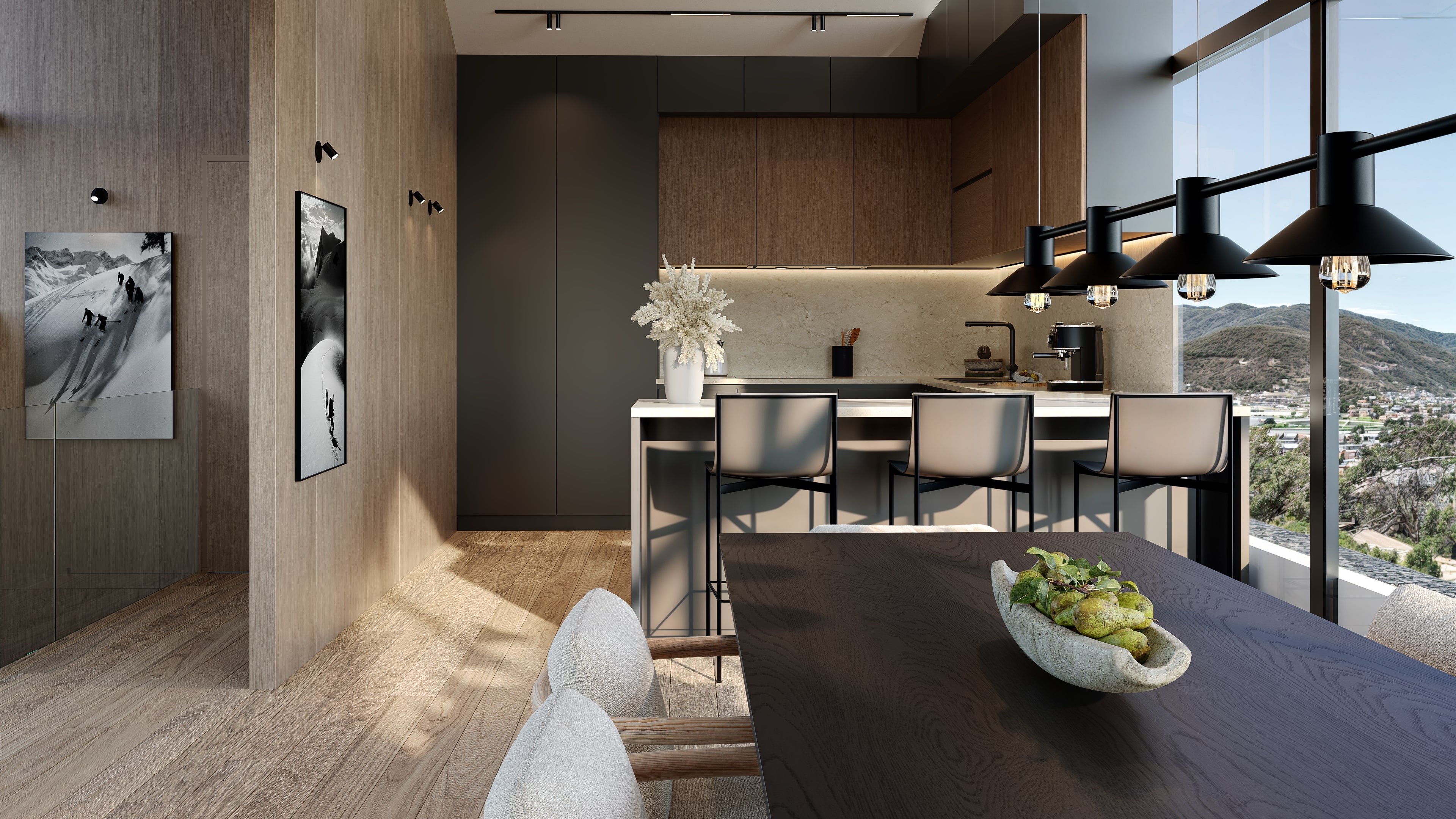 Espacios diseñados funcionalmente en un estilo minimalista, pero a la vez cálido. Materiales de primera calidad y acabados de alta gama.